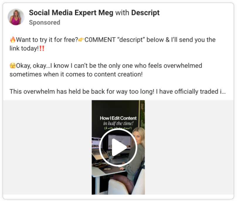 - Tutorials or demos: walkthroughs of how someone uses your product make great content for video ads placements on social or Google. They also work well on landing pages and onboarding flows. - Here’s an example for Descript.